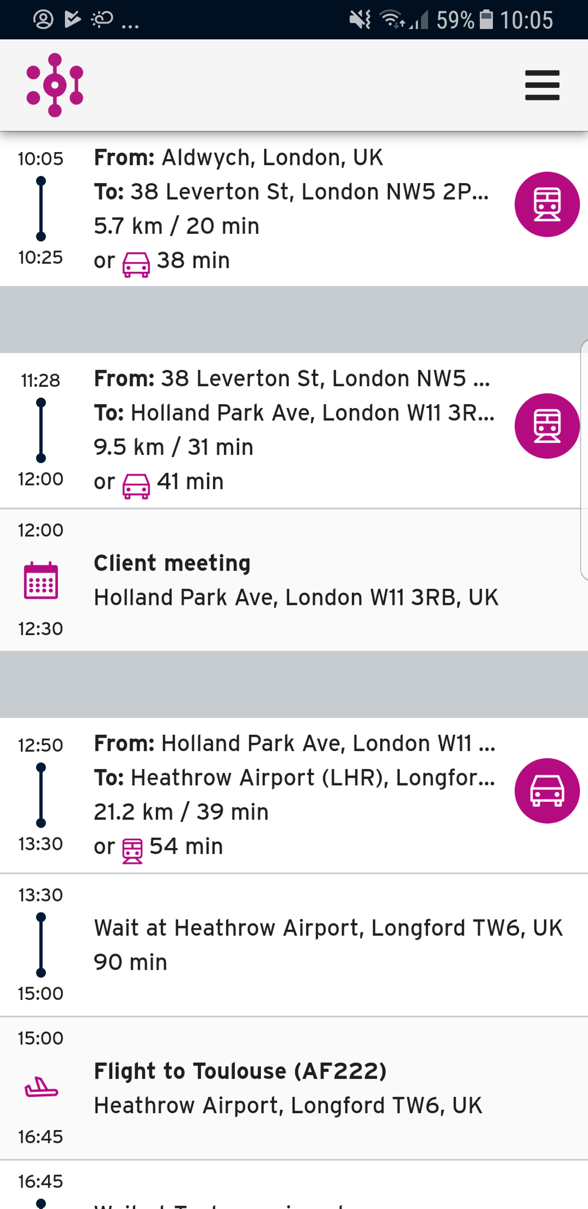 Using your calendar, kilometers generates an estimated commuting time to help optimize your journey. As well as saving you time, kilometers promotes sustainable solutions for your travels.